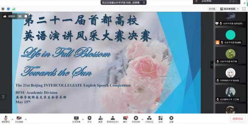 5月15日下午,第二十一届北京外国语大学英语文化节之首都高校英语演讲风采大赛决赛于线上成功举办。参赛选手们言辞流利,舌灿莲花,为观众带来了一场精彩的富有深度的演讲比赛。