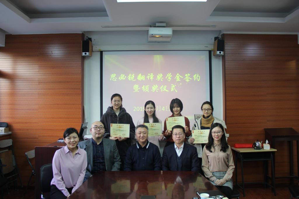2019年1月4日上午10:00,我院在115会议室举行“思必锐翻译奖学金”签约暨颁奖仪式。北京思必锐翻译有限责任公司副总经理许立群、人力资源部经理魏之洲、资源管理部经理王艺露、培训部项目经理刘雅堃,YABO鸭脖党总支书记路兴、辅导员张春霞、鞠丹、于承杰、王书剑,获奖学生刘欣然、张安莹、范柳依、潘越等参加了活动。