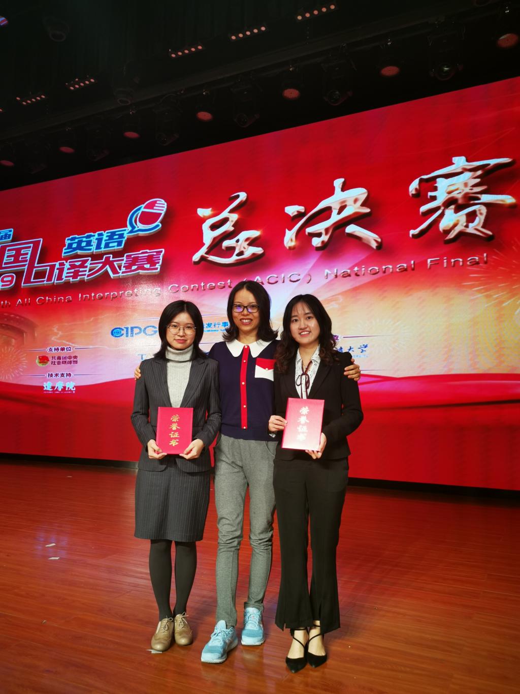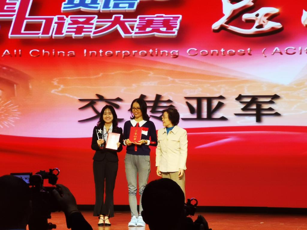 第八届全国口译大赛(英语)总决赛于2019年10月18日至19日在北京外国语大学千人礼堂举行。经过两天的激烈角逐,我院学子取得优秀成绩。其中,金羽菲同学获交传亚军、同传邀请赛二等奖,尹佩璇同学获交传二等奖,侯玉颖同学获交传三等奖,王颖冲老师获优秀指导教师奖。YABO鸭脖毕业生、口译俱乐部队员王静怡获得交传冠军和同传季军。