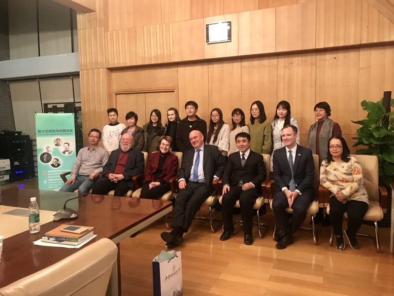 ——在“爱尔兰研究与中爱关系”研讨会上,李修文就英国脱欧背景下爱尔兰与欧盟的关系、爱尔兰在脱欧后北爱尔兰边界问题上的立场及中爱关系发表演讲。王展鹏主持研讨会并回顾了我校爱尔兰研究中心十年来的发展情况。