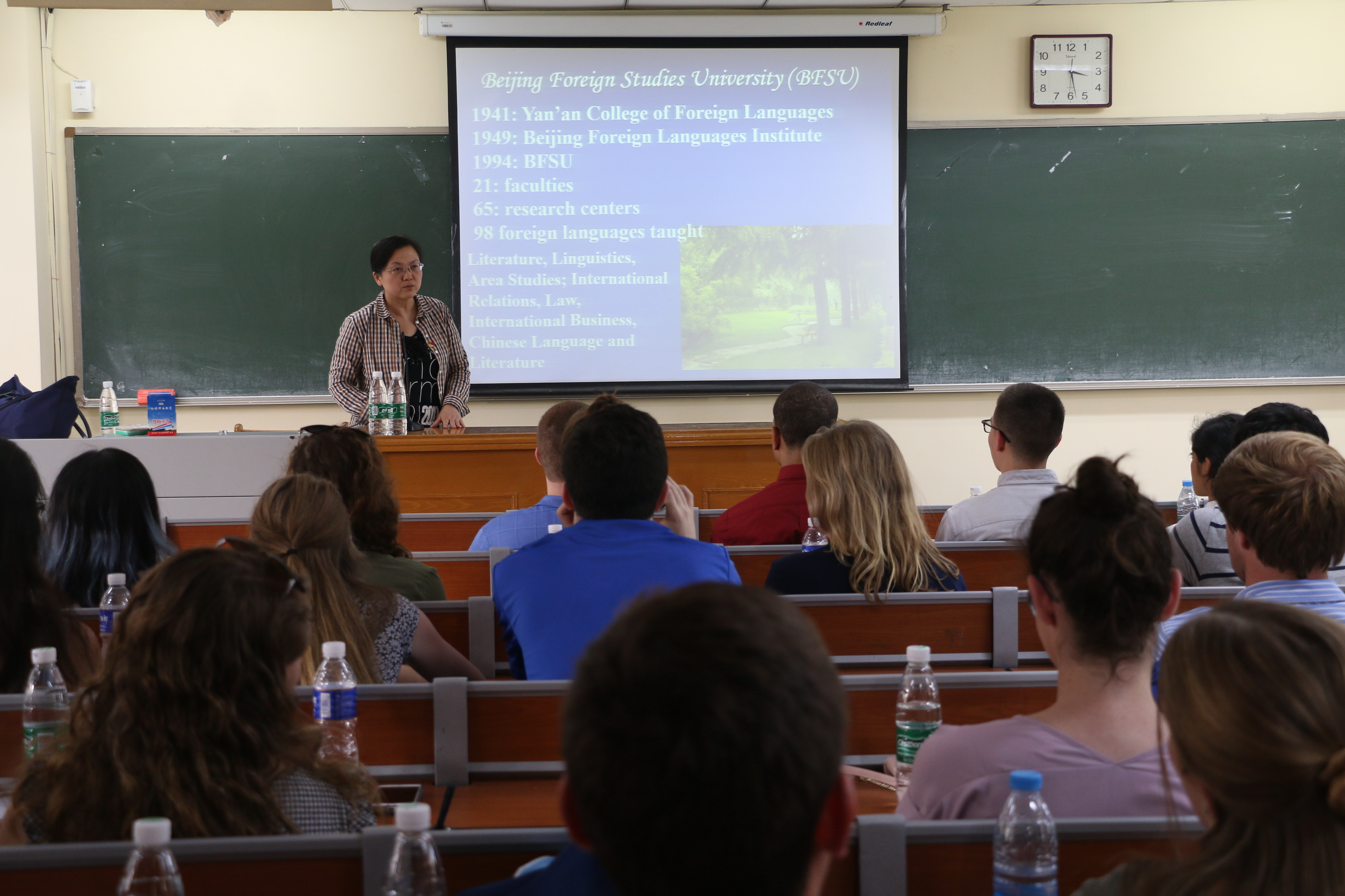 ——讲座结束后,学生志愿者与来访师生自由交流,带他们游览校园,进一步体会北外校园文化。此活动已举办11届,每年举办1-2场,深受学生欢迎。