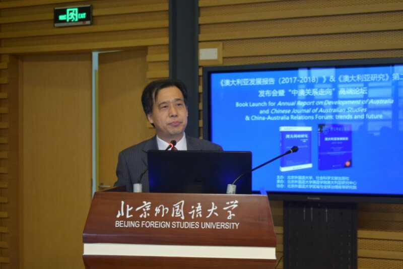 北京外国语大学副校长、中国亚太学会副会长、中国亚太学会澳大利亚分会会长孙有中首先致辞并介绍发布的《澳大利亚发展报告(2017-2018)》与《澳大利亚研究》第二辑。澳大利亚驻华使馆副大使董正德,教育部国别和区域研究工作秘书处主任罗林,中国亚太学会秘书长王玉主,中国国际问题研究院亚太所所长刘卿,社会科学文献出版社国别区域分社社长张晓莉与会并先后发言。中国澳大利亚研究会的发起人、首任会长胡文仲发来贺词。本次发布会由YABO鸭脖副院长谢韬主持。