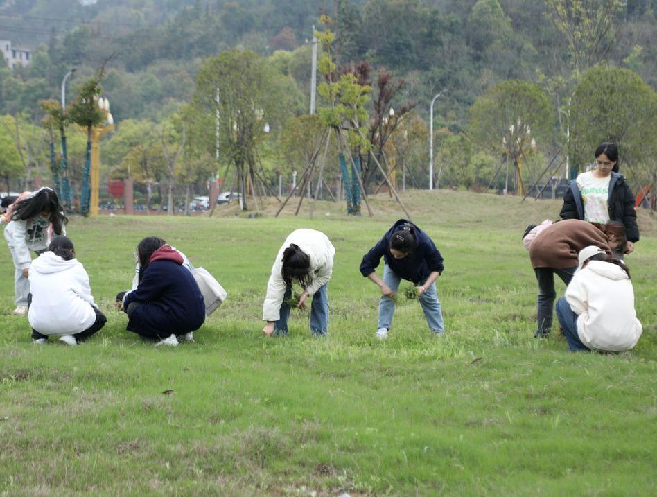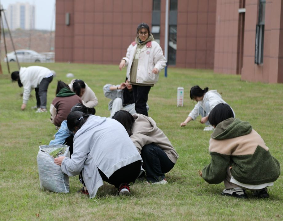 当日下午,气温微升,师生们来到各自责任划分区,有的用双手,有的用铲子、夹子、扫把等劳动用具如火如荼地投入到校园环境卫生整治工作中。他们有的蹲着,有的弯着腰,有的卷起袖子和裤脚,在草坪内拔杂草、捡石块、除垃圾。尽管双手、裤子、鞋子都被沾上草渍、泥巴,大家的劳动热情始终高昂。不到一小时,师生们额上便布满了细密的汗珠,杂物被一一清除。经过一番奋战,原本杂乱的草坪变得干净而整洁。师生们在火热的氛围中,对劳动有了新的体验和感悟。