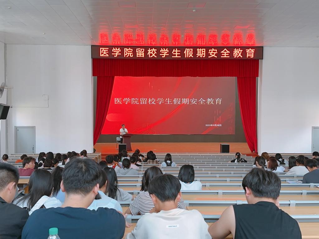 本站讯(医学院 刘倩)为进一步加强学生安全教育管理工作,增强学生自我保护意识,9月28日中午,医学院(附属医院)召开中秋节、国庆节假期留校学生安全教育大会,232名留校学生参加。会议由学工科科长李灿主持。