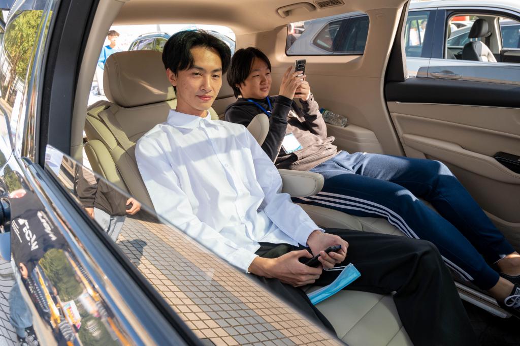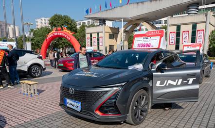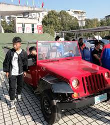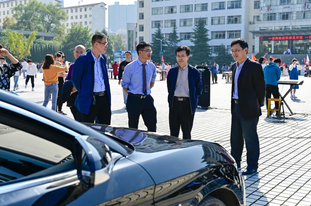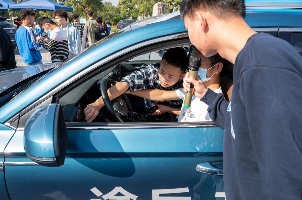 广场人头攒动,同学们纷纷走进展台,坐进汽车,近距离感受汽车魅力,了解新能源汽车性能技术。