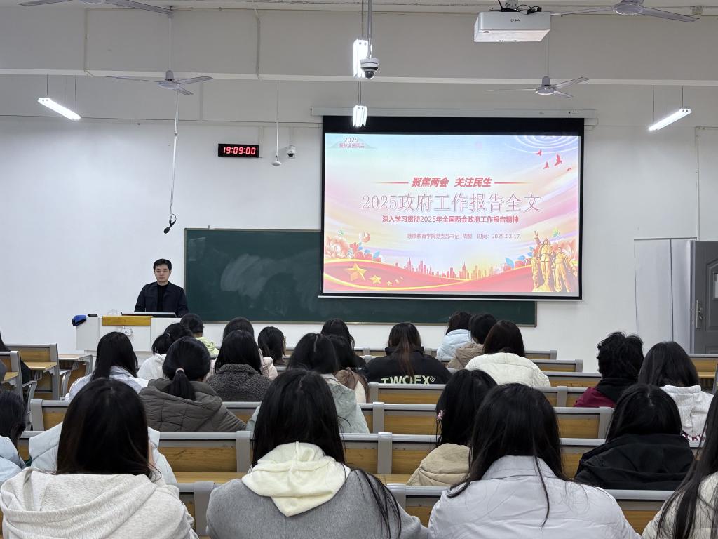 3月17日晚,继续教育学院党支部书记周昊在正心楼D108为继续教育协会的60余名成员讲授了一场专题党课,本次党课以“聚焦全国两会精神,凝聚青春奋进力量”为主题,旨在通过学习两会精神,激发学生的爱国热情,引导学生将个人成长融入国家发展大局。