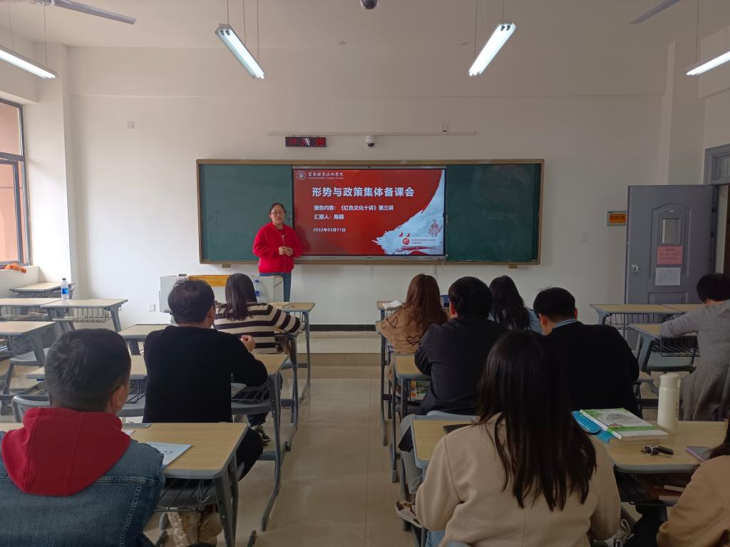 本站讯(马克思主义学院 宋彩虹)为落实常态化集体备课制度,加强思政课教师间的沟通交流,进一步提高形势与政策课教学质量,3月11日下午,马克思主义学院形势与政策教研室在正心楼B214召开了《形势与政策》集体备课会。会议由教研室主任曾骏主持,教师陈颖主讲,全体形势与政策课教师参加了备课会。