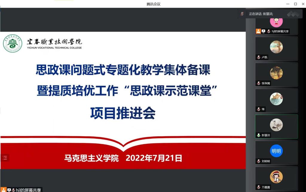 本站讯(马克思主义学院 宋彩虹)为贯彻落实中共江西省委教育工委、江西省教育厅《关于进一步推进“问题式专题化团队教学改革”工作方案》要求,进一步加强思政课教师队伍建设,深入推进开云官网思政课教学改革与创新,也为了更好地推进提质培优相关工作,7月21日上午,马克思主义学院通过腾讯会议召开问题式专题化团队教学集体备课会暨提质培优项目推进会。会议由马克思主义学院思想道德与法治教研室主任胡金兰主持。