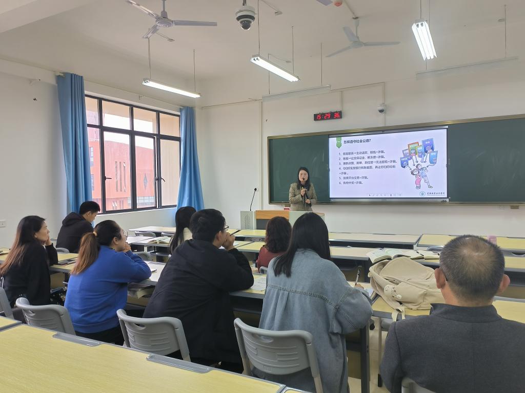 本次集体备课会分三个环节。首先,黄斌军、南丹两位老师分别就自己备课专题的教学设计、案例素材选取与运用、教学重难点突破、党的二十大精神融入本专题等问题进行了现场讲解。