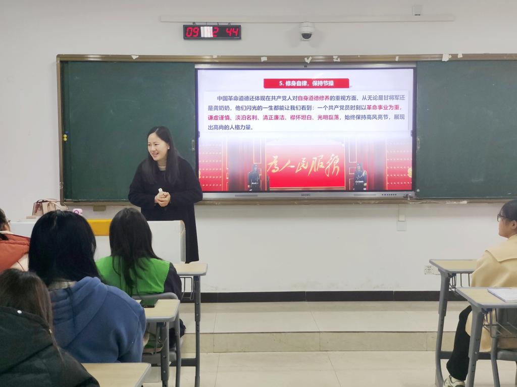彭慧洁通过讲述甘祖昌将军回乡当农民的故事,从“为实现社会主义和共产主义的理想信念而奋斗”“全心全意为人民服务”“始终把革命利益放在首位”“树立社会新风,建立新型人际关系”“修身自律,保持节操”五个方面,分析了中国革命道德的内涵及价值,号召青年学生积极弘扬中国革命道德、廉洁文化,做红色基因的学习者、传承者、践行者,不负时代,不负韶华,在新时代新征程上贡献青春力量。