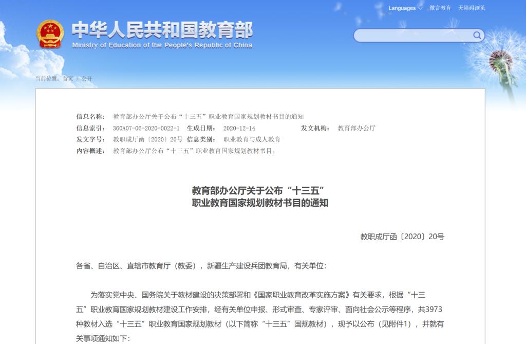 本站讯(教务处 吴少林)近日,根据《教育部办公厅关于公布“十三五”职业教育国家规划教材书目的通知》教职成厅函〔2020〕20号,为落实党中央、国务院关于教材建设的决策部署和《国家职业教育改革实施方案》有关要求,根据“十三五”职业教育国家规划教材建设工作安排,经有关单位申报、形式审查、专家评审、面向社会公示等程序,共3973种教材入选“十三五”职业教育国家规划教材,其中高职教材2828种。kaiyun开云官方网站易滢老师主编的《古汉语与文学基础》教材入选。