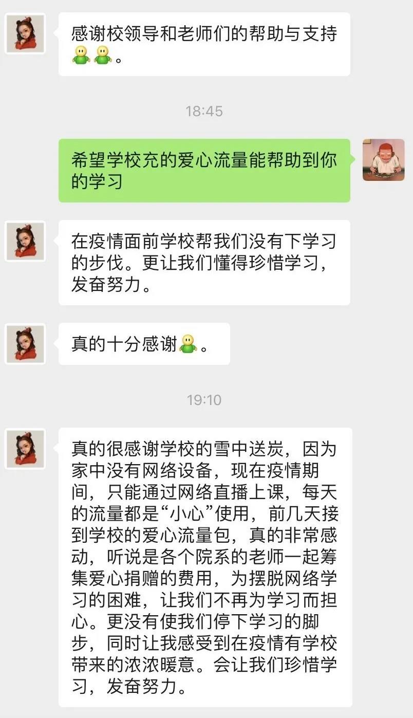真的很感谢学校的雪中送炭,之前我每天的流量都是小心使用,前几天接到学校的爱心流量包,真的非常感动,听说是老师们筹集的爱心捐赠费用,帮我们解决了网络学习的困难,让我们不再为学习而担心,更没有使我们停下学习的脚步。特殊时期,我感受到了学校带来的浓浓暖意,我一定会加倍珍惜,发奋努力学习。