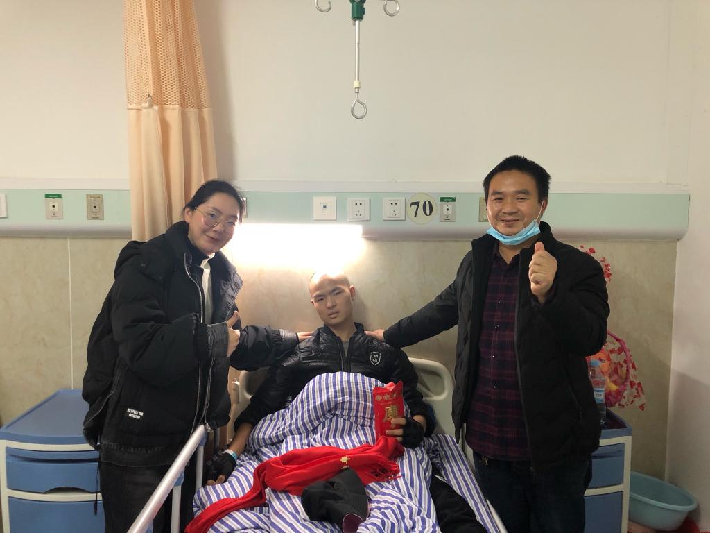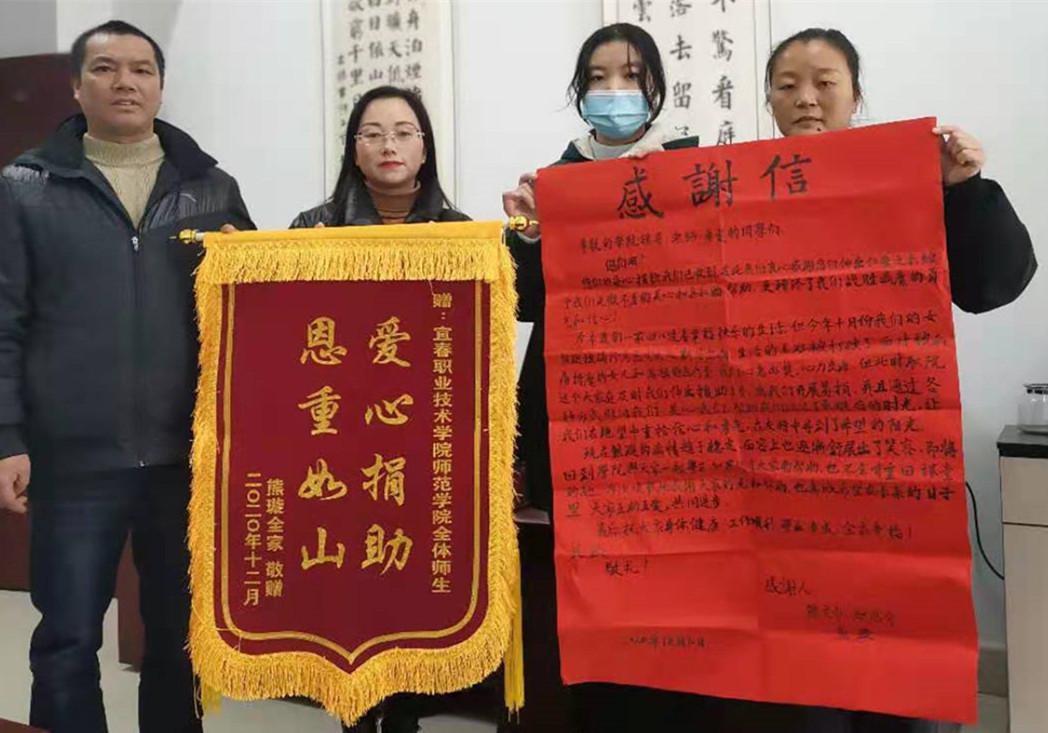 为帮助这两位师范学子筹集医药费,师范学院领导高度重视,立即带头捐款,同时向师范学院全体师生发出捐款倡议。在院领导的带动下,大家纷纷慷慨解囊,300元、200元、100元、50元、20元……,最终筹集善款41408元。随即,学院安排老师兵分两路迅速将善款送到学生手中。患病学生及家长见老师们专程前来探望,激动不已,对学校和师生们的关爱及资助表示深深的感谢。为表达心中的感激之情,熊璇家长还特意来校赠送了锦旗和亲笔书写的感谢信。此次探望之行,为患病学生送去的不仅仅是满载爱心的善款,更承载着全院师生对患病学子满心的祝福和帮助他们战胜病魔的决心。