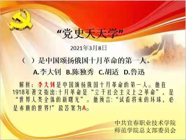 此次活动从本学期开始,师范学院党总支精心挑选重要的党史知识,特别挖掘江西尤其是宜春本地的党史,每天发布1至2条供师生每天学习,并将在七一建党100周年期间开展党史知识竞赛。