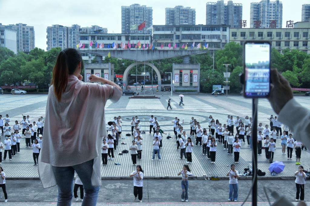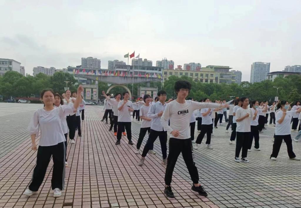 为响应疫情防控工作,此活动分为线上和线下开展。线上由宜职大通社的学生负责通过官抖直播;线下参与活动的学生在工作人员引导下到达指定位置,并保持前后左右间距1米以上。活动伊始,由领舞同学带领大家暖场热身,大家认真仔细,保障身体各关节充分活动开。伴随《本草纲目》动感十足的音乐,学生们纷纷跟着领舞同学起舞,用心怒放,将青春的活力尽情挥洒。温热的太阳洒向每一位活力四射的学生,不一会儿大家的额头上都冒出了一粒粒汗珠,在领舞的同学的带领下,学生们的舞步成了宜职闭环期间最靓丽的一道风景线。