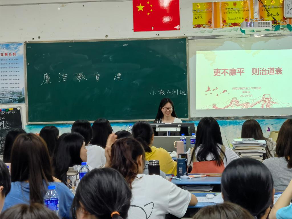 本站讯(师范学院党总支 黎佳佳)为进一步提高学生廉洁意识,形成良好的廉洁自律氛围,5月27日晚8点,师范学院学生工作党支部在第一教学楼D404教室开展大学生廉洁教育专题讲座。此次讲座由学生工作党支部书记黎佳佳老师主讲,部分在校的学生党员、入党积极分子和20级小教专业学生聆听。