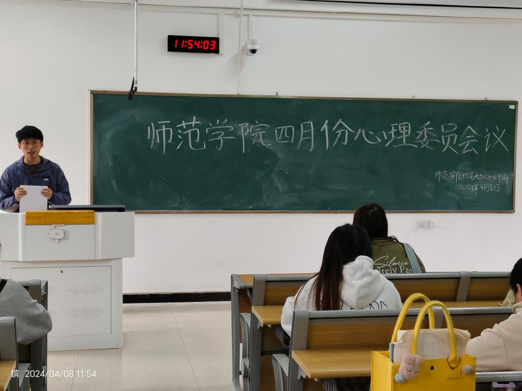 本站讯(师范学院 吴滨欣)为更好开展“心理健康教育月”主题活动,4月8日中午,在正心楼D209教室召开了四月份全院心理委员会议。本次会议由辅导员吴滨欣主持,全院心理委员共计90余人参会。