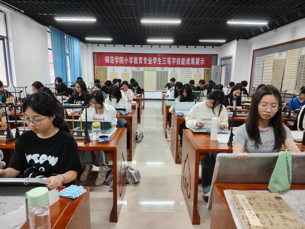 师范学子们展示了学前教育专业、早期教育专业和婴幼儿托育服务与管理专业的手工技能,包括刻纸、制作扭扭棒、剪纸等,同时也展示了粘贴画、非遗剪纸作品、梳子等手工作品。徐晴老师携同学们向大家呈现师范生基本技能——三笔字技巧,同学们现场书写粉笔字,展现扎实的书写基本功;在实训室的作品展示台上,还张贴了数幅优秀的毛笔书法作品,供众人欣赏。学院教务科组织30周岁以下的青年教师开展书写基本功比赛,比赛要求青年教师们同时完成粉笔字和硬笔字的现场书写,以全面检验青年教师的书写水平,促进教学技能的提升。徐静老师和同学们向大家展示了学前教育专业、早期教育专业的舞蹈基本功,曼妙的舞姿、扎实的基本动作让人赞不绝口。此外,学院还举行了线上视频大赛活动,向35周岁以下的青年教师们征集0—6岁婴幼儿关于STEAM课程、喂养照护、绘本等各方面的短视频,展现青年教师们的专业素养和创新思维能力。