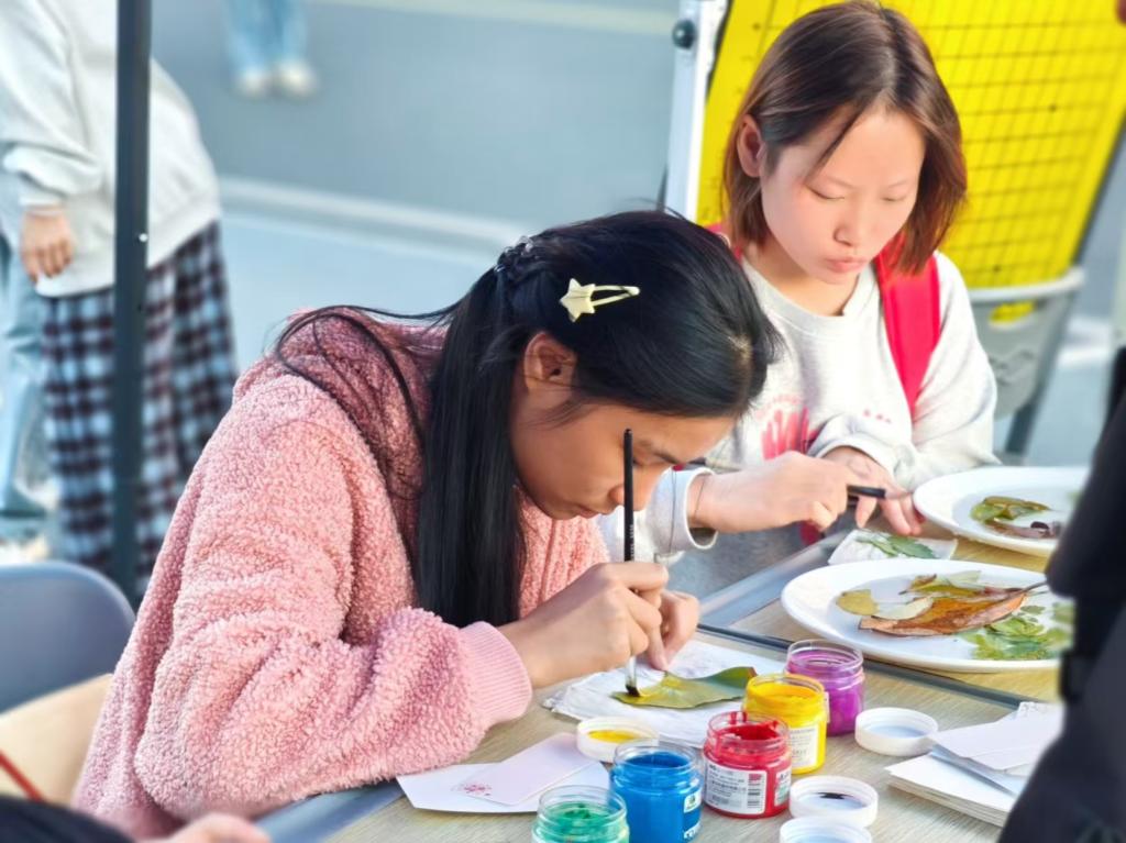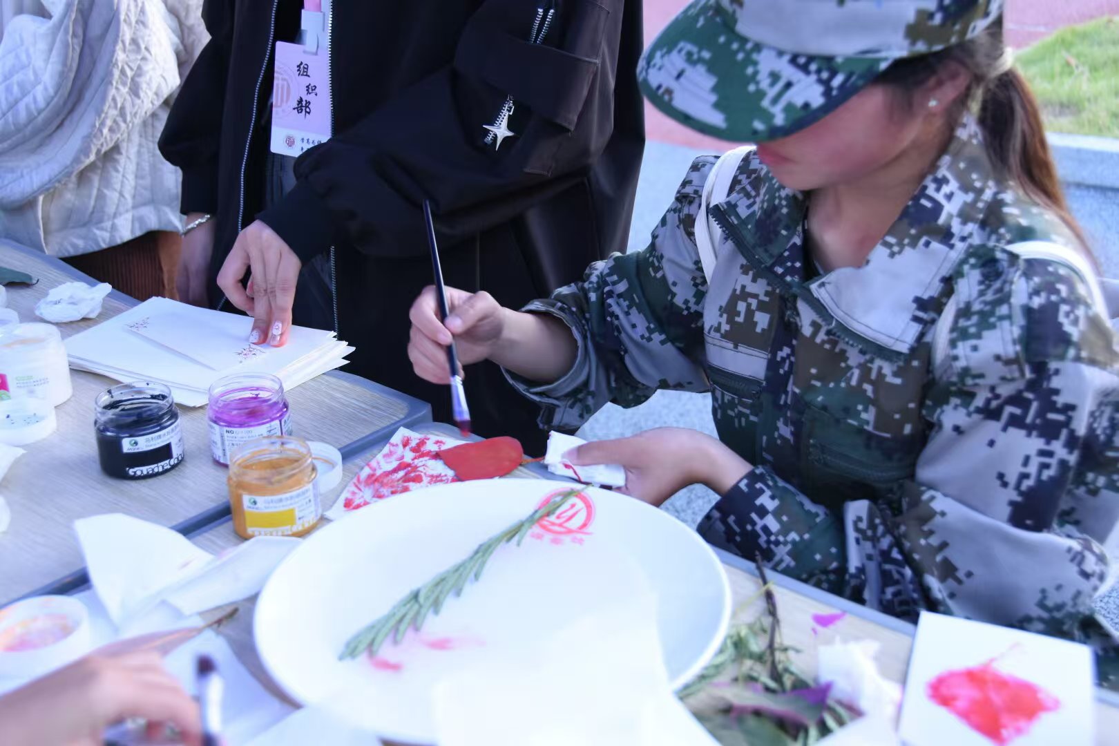 天上繁霜降,人间秋色深。本次精品活动主要围绕“霜降节气”和“中国传统文化”开展,通过设置“文化体验”和“游戏互动”等环节,让同学们在实践中感受节气文化的丰富内涵和传统文化的现代魅力。活动现场热闹非凡,生动有趣的游戏互动吸引众多同学驻足参与,大家全神贯注,摩拳擦掌,通过参与一系列趣味节气游戏,触摸文化历史,感知传统魅力。文化体验环节,同学们动用巧思,或用颜料在落叶上描绘出秋的五彩斑斓,或用小锤子在纸上捶印出秋叶的形状,或发挥奇思妙想,沉浸在制作独特的落叶风铃和书签的体验之中。