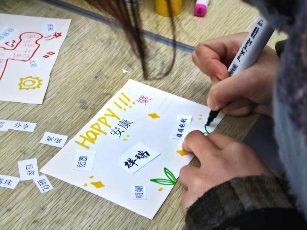 本次主题活动围绕“新年祝福”与“传统文化”开展,通过设置“拼贴祝福”和“神秘猜猜猜”活动,让同学们在游戏中增进情感交流,感受新年的喜悦与温暖。拼贴诗是诗歌创作方式的一种创新,将裁剪下来的文字、语句经过拼贴能重新编织成一首崭新的诗歌。“拼贴祝福”环节,同学们灵感迸发,以字传情,将文字重新编织。一首首温馨的小诗,凝聚着同学们的丰富想象力,更传递着大家对新年的美好憧憬和美好祝福;“神秘猜猜猜”是对“猜灯谜”这一古老民俗文化的创新,同学们通过抽签解签的形式,在字里行间中探寻谜底的蛛丝马迹,活动现场其乐融融,欢声笑语不断。
