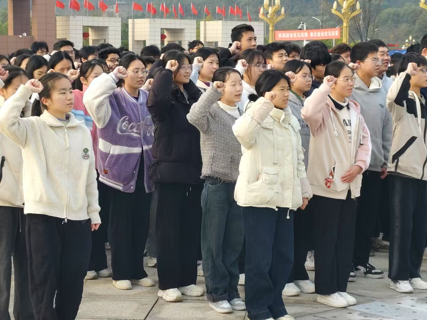 国旗护卫队步履铿锵,护卫着国旗迈向升旗台。《义勇军进行曲》的旋律穿透雾霭,师生们庄严肃立,齐声高唱,鲜艳的五星红旗在注目礼中冉冉升起。升旗礼毕,邹晓英发表讲话,告诫广大学子要有危机忧患意识,不忘初心、牢记使命,践育人师道,做民族复兴的接力者。