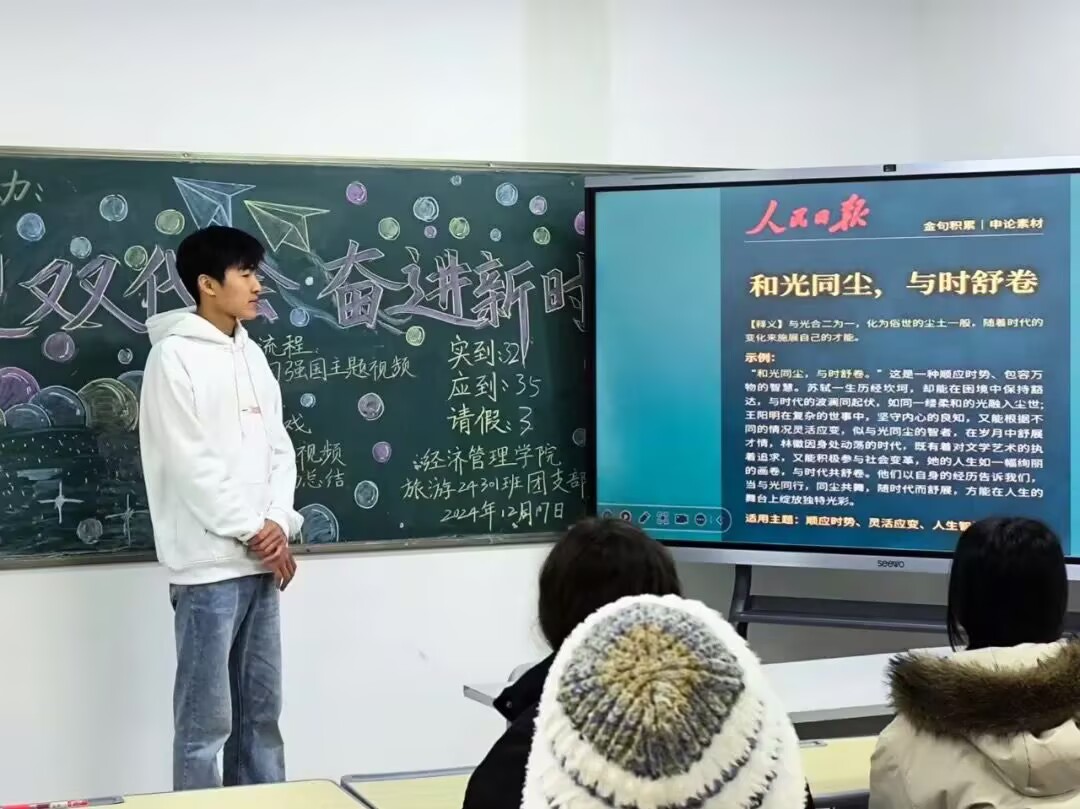 本站讯(团委 曹招 刘嘉妮 王玮 学生记者 邹欣宇 鲁思甜)为凝聚青年学子新生力量,以昂扬的精神面貌迎接双代会,12月17日晚,开云官网在全校范围内开展 “喜迎双代会 奋进新时代” 主题团日活动。此次示范性主题团日活动由师范学院学前教育24301班团支部承担,校党委委员、副校长张彩凤,师范学院党总支书记邹晓英,师范学院院长肖勇,各二级学院团总支负责人进行着现场观摩,并且全程现场同步直播。活动中,同学们通过视频学习和知识问答的互动,加深了对双代会相关知识的理解;《舞蹈串烧》的环节展示了当代青年的热情。朗诵《新时代少年》,同学们用激昂的语调展现新时代少年的壮志豪情;分享环节,同学们积极发表自我感言,畅所欲言。最后,同学们一起合唱《夜空中最亮的星》,祝愿大家在成长道路上如同夜空中最亮的星一般熠熠生辉。此外,各二级学院团支部紧扣主题,形式多样,内容丰富,通过讲解、讨论、观看视频等方式开展此次活动,深入阐释双代会的重要意义。最后,师范学院学前教育24301班团支部作为此次示范性主题团日活动承办班级荣获第一名;艺术与设计学院(军事体育部)学院书画艺术24301、24302联合团支部荣获此次活动第二名;经济管理学院旅游管理24301班和艺术与设计学院(军事体育部)艺术教育24301、24302班团支部荣获此次活动第三名。