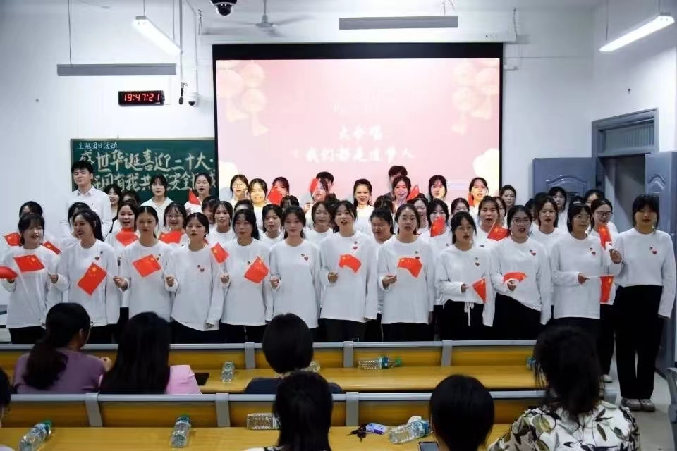 活动中,各班团支部紧扣主题,采用PPT展示、故事分享、情景演讲等形式多样化开展此次活动。此次的示范性主题团日活动由护理学院助产22301班承担,校团委全体工作人员、各学院团总支书记及各二级学院学生代表现场观摩了此次活动,同时此次示范性主题团日活动也在“宜春职院青年”视频号上进行全程直播,供全校师生观摩学习。活动围绕庆国庆、喜迎党的二十大,坚决捍卫国家安全三个部分灵活开展,以丰富多彩的节目将多个主题融会贯通。同学们通过观看学习强国平台相互交流心得体会,让大家重温了祖国在党领导下的百年奋斗光辉历程。随后,通过生动演绎《国家安全、人人有责》情景剧片段,引导着同学们领会国家安全人人有责、人人可为的深刻内涵,并通过大声朗诵《读中国》,在同学们的心中厚植爱党爱国情怀。活动最后,同学们铿锵有力、激情澎湃地合唱《我们都是追梦人》,表露出青年学子们必将肩负起实现中华民族伟大复兴重大历史使命的决心。活动结束后,校团委书记施旸从前期准备和活动程序上肯定了活动开展效果,活动环节紧凑有序、富有青春朝气,展现出了当代大学生奋发向上的时代风采,同时针对活动细节指出了不足及改进建议。她提出,要始终牢记习近平总书记的殷殷嘱托,希望更多青年学子尽展强国有我,奋进新时代的青春向党之心。