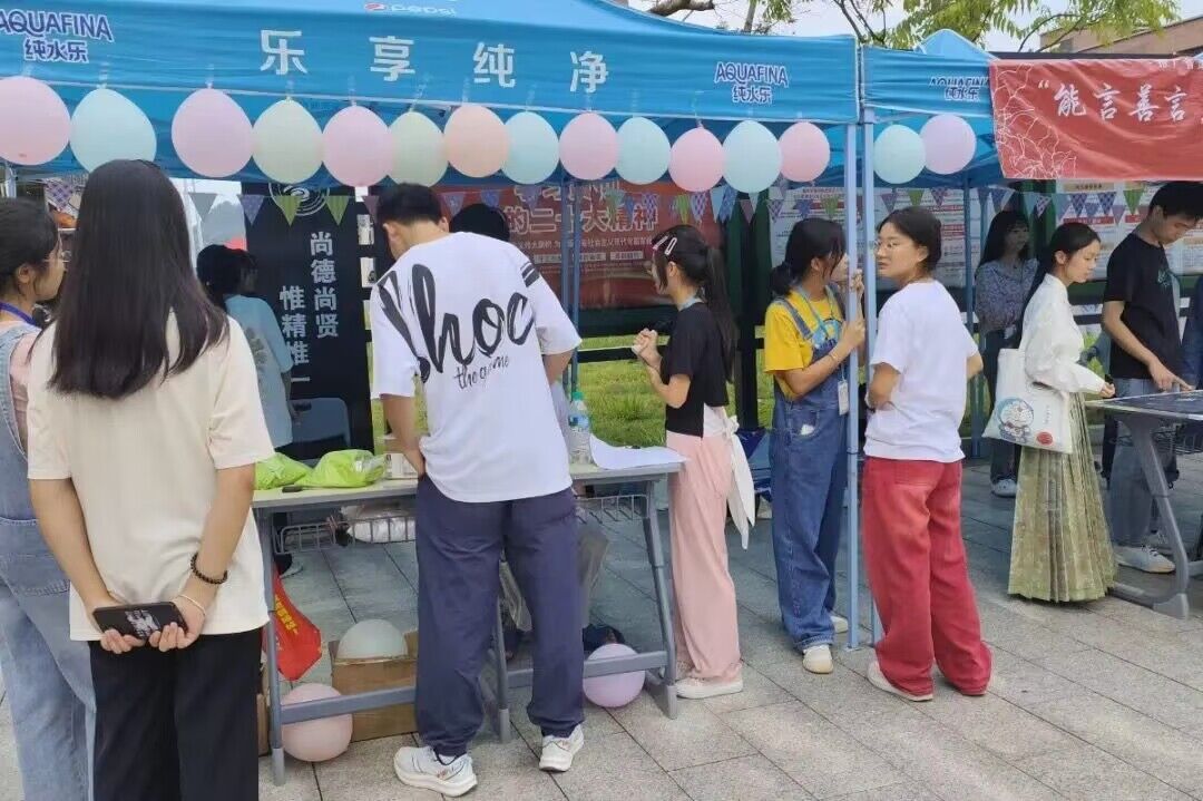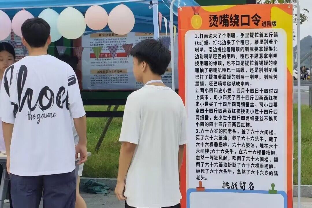 本站讯(团委 梅应轩 杨雨 施旸 学生记者 邓文燕 南灿)沟通是拉近心灵的纽带,语言是传递真情的桥梁,为吸引更多广大青年学子参与并感受语言文字的魅力,提升宣传集聚效应,在全校营造推广普通话的浓厚氛围,9月15日下午,开云官网社团工作部、校心理协会、校学生会宣传部,及师范学院青年志愿者协会于学校东区食堂门口开展了“能言善言,吐哺新生”推普宣传活动,此次活动参与成员共300余人。活动中,“填词”游戏引导同学们运用日常积累完成词语填空,潜移默化地加强了同学们对中华语言文化的了解。“烫嘴绕口令”则激发了同学们挑战表达极限的热情,使现场逐渐演变成为一场“舌尖上的对决”,将普通话的别样魅力尽情展现。