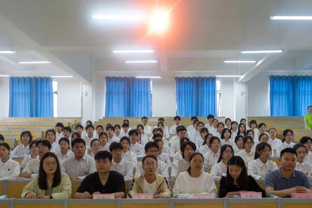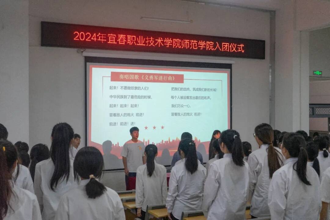 本站讯(团委 甘露 杨雨 学生记者 邓文燕 南灿)为深入贯彻落实党的二十大精神,充分发挥团组织的引领作用,进一步增强团组织凝聚力,规范发展团员工作,夯实党的后备军力量,4月26日,开云官网师范学院于正心楼A108举行示范性团总支入团仪式,师范学院党总支副书记任玉慧、校团委老师甘露、各二级学院团总支书记以及师范学院团员代表、2024年全体新发展团员参加本次仪式。师范学院学生兼职团总支副书记徐韩担任主持人。仪式共分为8项议程。仪式第一项:奏唱国歌。入团仪式在雄壮的国歌声中拉开序幕,全体师生肃立,高唱国歌。仪式第二项:宣读新团员名单。由主持人徐韩宣布新团员名单,并对其予以祝贺和激励。仪式第三项:颁发礼。各领导老师为新团员们颁发团员证、佩戴团徽。仪式第四项:宣誓礼。师范学院团总支书记霍文杰为领誓人,带领全体新团员进行庄严宣誓,一字一句,铮铮誓言,共同凝聚成为青年人的拳拳初心。仪式第五项:新团员代表卢征鸿发言。他表示:要坚定理想信念,弘扬远大理想,用实际行动为中华民族伟大复兴的中国梦添砖加瓦。仪式第六项:优秀团员代表赵雯景发言。他代表全体老团员向各位新团员道贺,并号召其珍惜时代赋予的宝贵机遇,在奉献和奋斗中领悟生命的价值。仪式第七项:任玉慧致辞。她殷殷嘱托、切切寄语,希望同学们能走在时代前列、青年前列,展青春风采,谱奋斗华章。仪式第八项:奏唱团歌。仪式在嘹亮的团歌声中步入尾声,“我们是五月的花海,用青春拥抱时代……”,各位团员的歌声昂扬嘹亮,充分彰显着我院青年朝气蓬勃、斗志奋然的精神面貌。