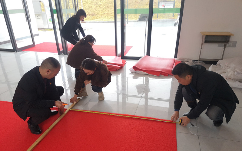 一大早,两个支部的党员们自带工具,来到静园1栋学生宿舍。大家根据实际情况商议如何铺设红毯比较合理,现场裁剪、分发、铺设。同志们干得热火朝天,不时传来阵阵欢笑声。