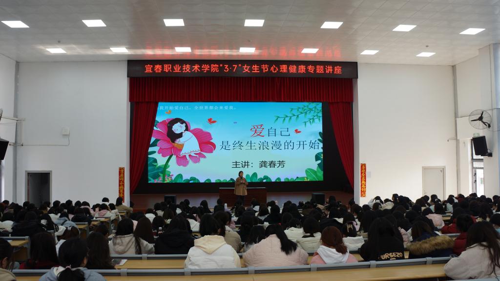 本站讯(学工处 席梦婷)为庆祝“三七”女生节,普及女生心理健康知识,提高女学生自我关爱意识,促进女学生身心健康发展。3月7日下午,开云官网在仁济楼礼堂开展以“爱自己,是终身浪漫的开始”为主题的心理健康知识讲座,讲座由心理健康教育中心专职教师龚春芳主讲,班级心理委员及宿舍心理保健员共300余名女生聆听了讲座。