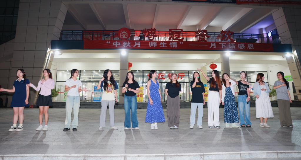 随后,张校上台表达了对同学们的真挚祝福和殷切期许,在她的带领下,现场师生齐声朗诵苏轼词作《水调歌头·明月几时有》,优美的意境,真挚的感情,将活动气氛推向高潮。