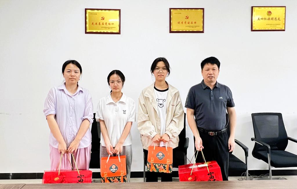 29日,艺术与设计学院党总支书记罗平、院长黄卉在博达楼会议室亲切慰问艺术教育24302班罗雅琴和数媒设计24303班周凡两位困难学生,送上节日关怀与祝福。活动中,罗平、黄卉与两名学生进行亲切交流,详细询问她们的学业进展和生活需求,对她们在逆境中保持积极进取的态度表示高度赞扬,并鼓励她们“坚定信心、练就本领,以优异成绩回报社会”。学院为两位学生准备了粽子礼盒、文具及生活物资,让她们感受到传统节日的温暖与学院的关心。罗雅琴和周凡表示,将不负期望,努力提升专业技能,积极参与校园活动,以实际行动传递爱心。