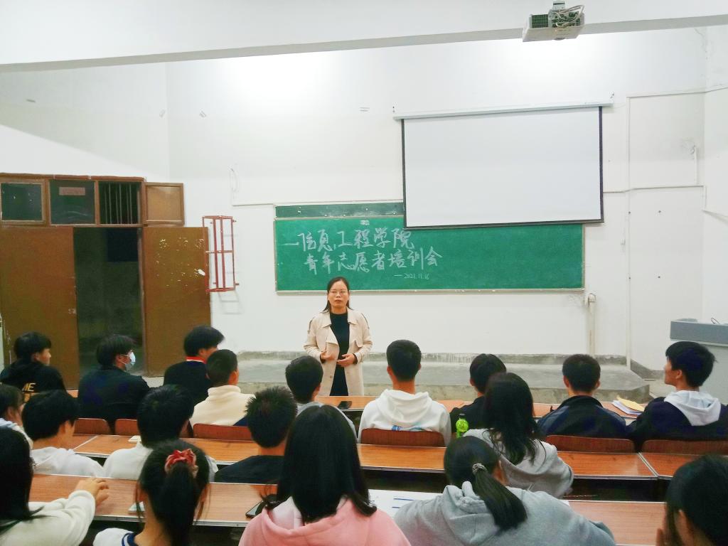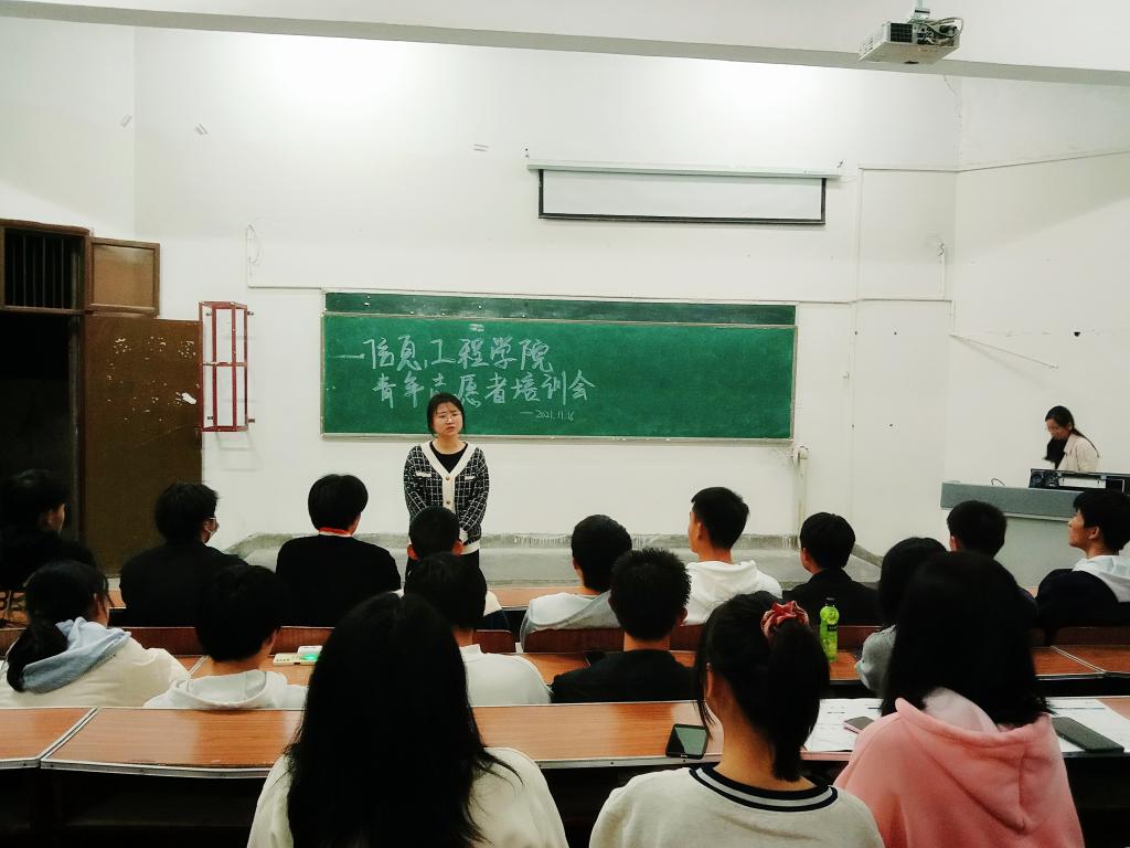 本站讯(信息工程学院 谢小欣 学生记者 丁水玲)为了进一步增强青年志愿者综合素质,提升志愿服务质量和水平,2021年11月16日晚,信息工程学院青年志愿者协会在信息楼阶梯教室开展了主题为“创建文明校园,奉献青春力量”的青年志愿者培训会议。