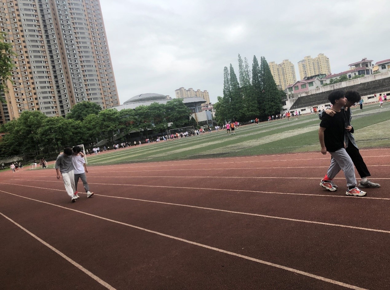 本次活动的主题叫“两人三足接力赛”。老师将学生分为四支队伍,每队10名学生,2人一组。每支队伍发放1根红绳,每个小队的第一组组员将红绳分别绑在左腿和右腿上,待准备好后出发50米的跑步比赛。每个小组完成后红绳传递给下一个小组,用时最短即为胜出。活动全程同学们情绪高涨,积极性非常高。