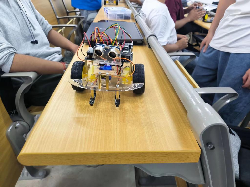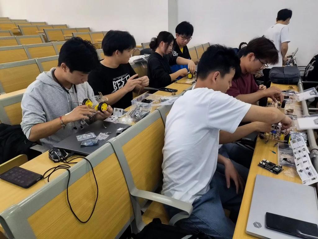 活动中同学们详细地了解组装方法及各个零件的功能后开始了智能小车的组装,部件分类、连接整理线路、安装控制驱动和避障模块,组员间互相沟通交流,合作完成了一辆辆小车的组装,装上电池,小车顺利启动完成调试。