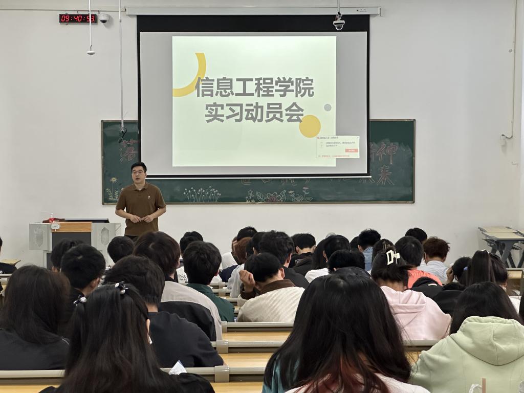 本站讯(信息工程学院 袁勋)为切实有效地提升实习质量,引导学生准确深刻地理解和正确对待实习工作,充分激发学生实习主动性与积极性64日,信息工程学院智云楼B102阶梯教室召开2025届毕业生秋季实习动员会。综合科科长袁勋、各毕业班班主任以及全体毕业班学生参会。