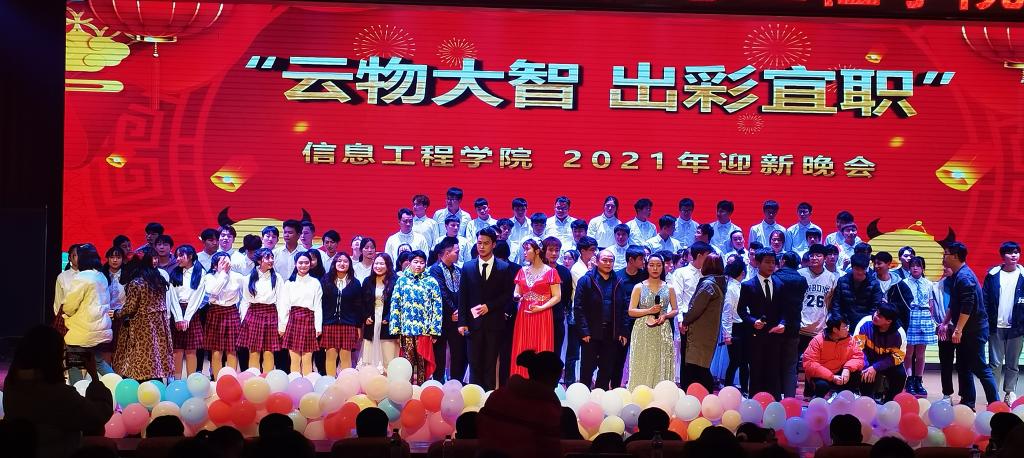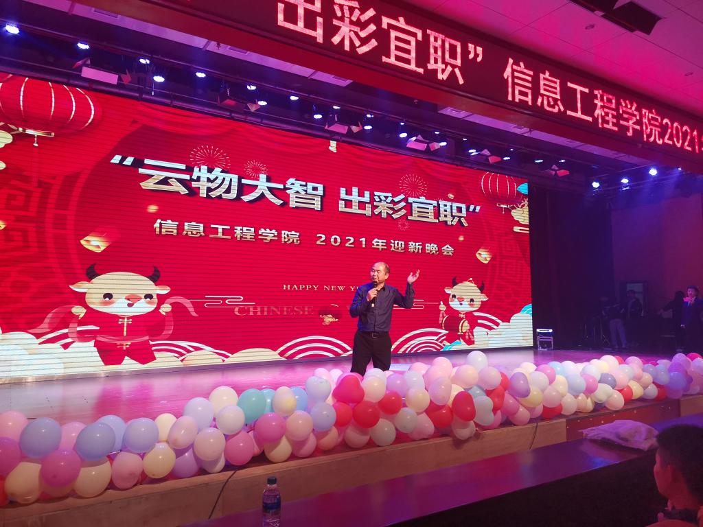 12月25日晚,信息工程学院“云物大智,出彩宜职”2021年迎新晚会在校本部科技综合楼2楼学术报告厅隆重举行。出席本次晚会的有信息工程学院院长王军民、党总支书记罗来曦、副书记简靖韡、副院长陈根金等行政人员、各班班主任。