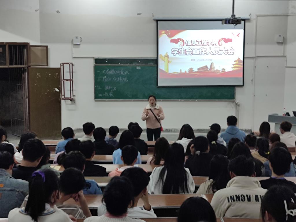 为增强学生会工作人员责任意识,明确新学期工作目标与任务,提高管理效率,316日晚,信息工程学院于三楼阶梯教室召开了全体学生会工作人员大会,团总支书记温倩主持会议并作了讲话。