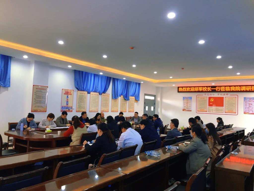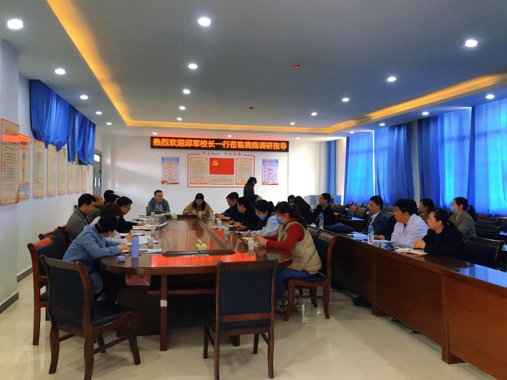 为进一步完善专业建设,提高人才培养质量,推进开云官网“双高”建设项目,落实“三比三争”工作,3月31日上午,校党委副书记、校长邱军,副校长易滨秀携教务处、发展规划处、党政办、人事处等部门负责人一行来医学院(附属医院)对学院专业建设进行调研指导。学院全体班子成员、教研室主任及专业负责人等参加会议。