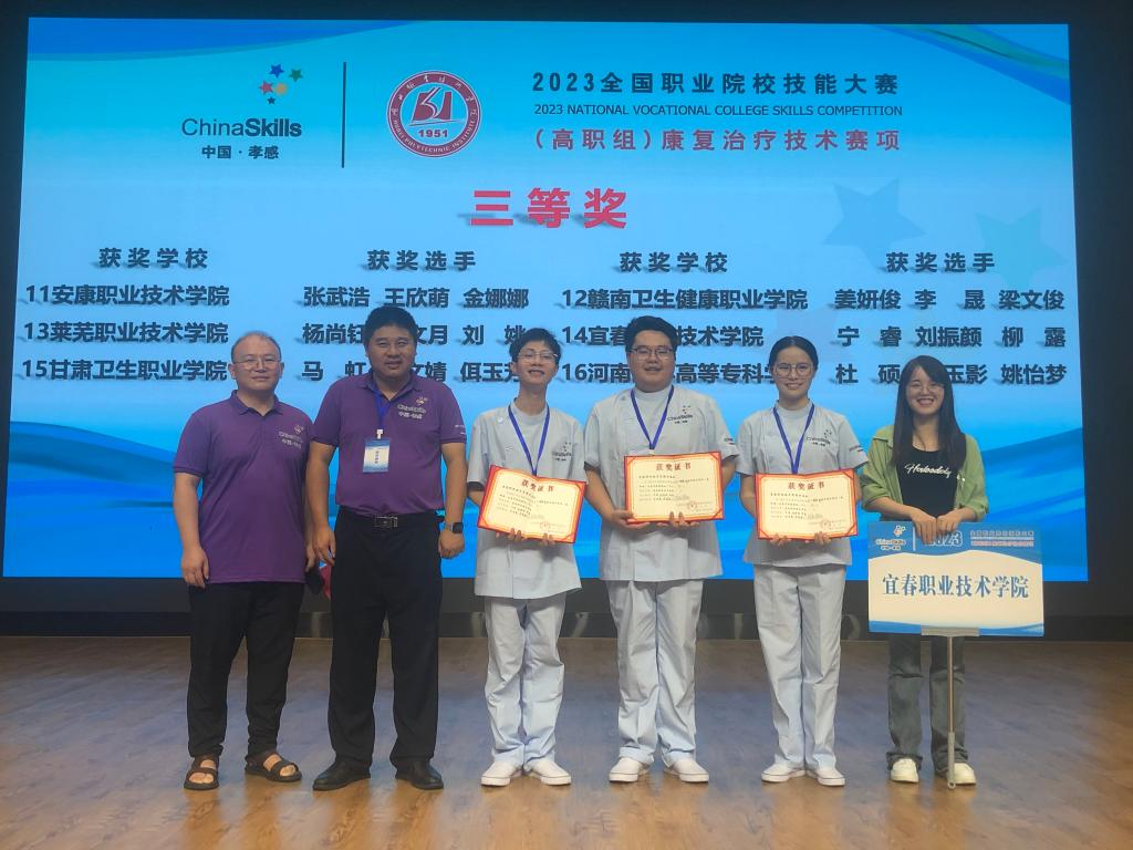 7月28日-30日,第一届全国职业院校技能大赛(高职组)康复治疗技术赛项在湖北职业技术学院举行。本次大赛由教育部、国家发改委、湖北省人民政府等36个部门和单位主办,来自全国28个省市、53支队伍齐聚孝感。开云官网医学院康复治疗技术专业学生柳露、宁睿、刘振颜参赛,荣获国赛三等奖。