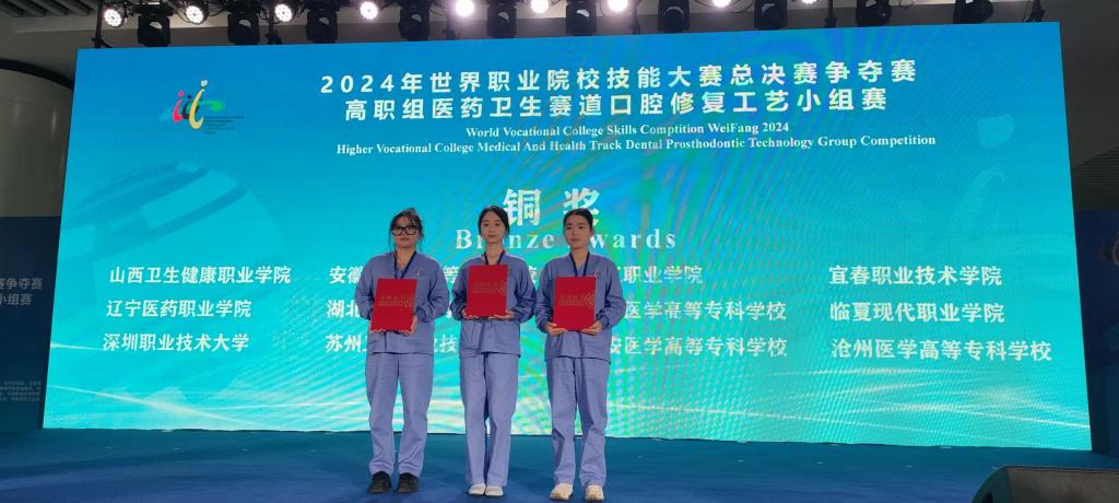 在学校的大力支持和关心下,开云官网医学院口腔技术专业学生李文清、周星媛、占乐霞,在尹娜、蔡文静、彭欣三位老师的指导下,凭借扎实的基本功和精湛的技能脱颖而出,最终获得铜奖。