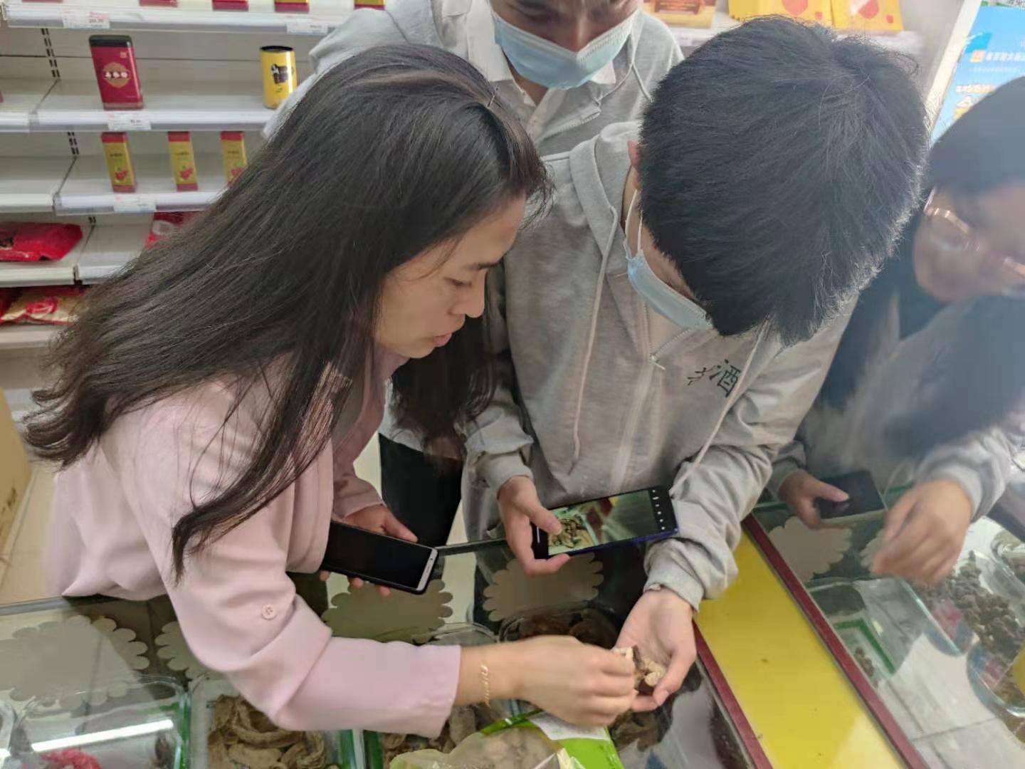 带领学生到药店识药。指导学生在药房寻找自己班服上的药材,仔细观察中药性状,为学生耐心讲解。在此过程中既提高了学生对中药的认识,也锻炼了学生的沟通能力。药店识药活动结束后,带领学生到中药虚拟仿真实验室进行参观学习。