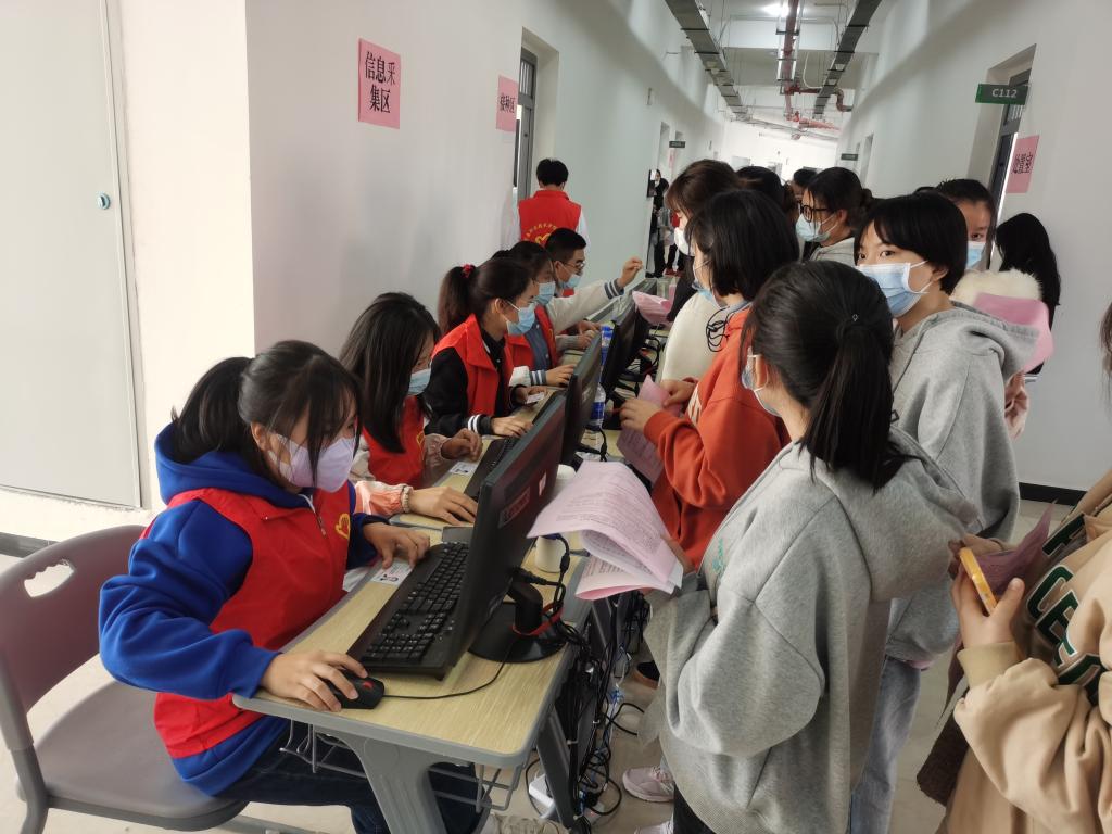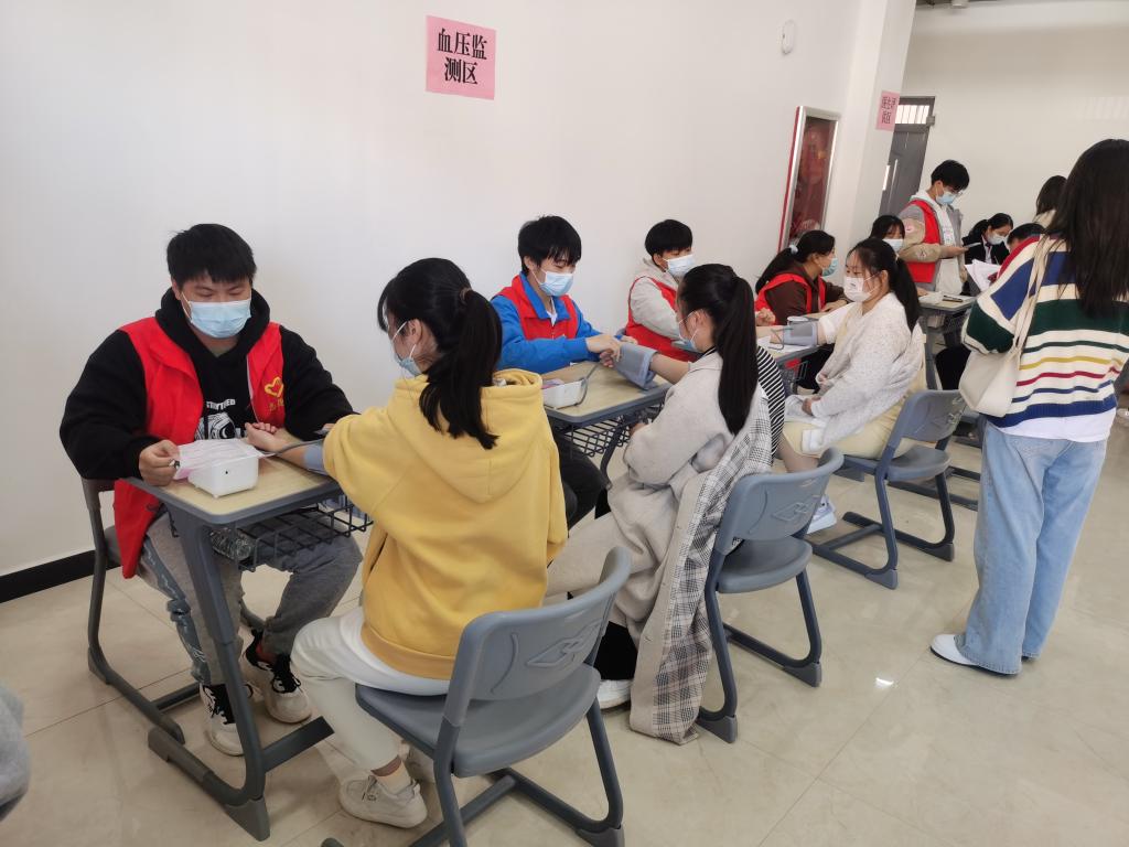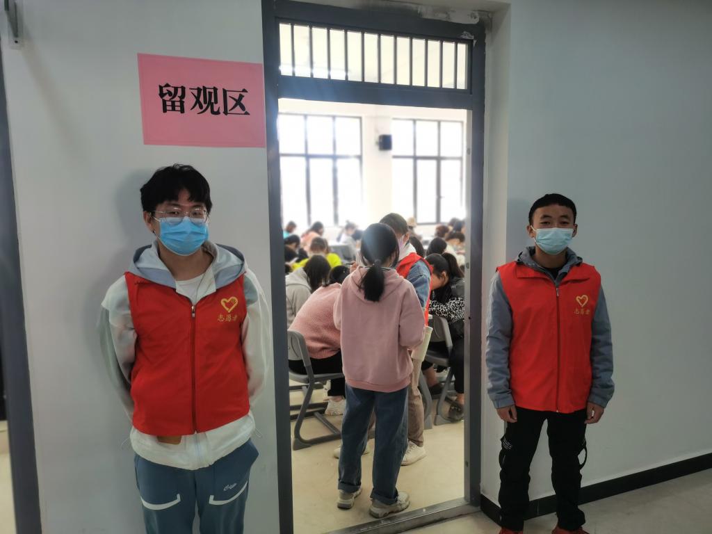 疫苗接种现场,分为排队等候区、血压监测区、医生评估区、信息采集区、接种区、留观区,志愿者们分工明确,各司其职,坚守岗位。“请大家领取信息登记表填好后排好队伍。”等候区的志愿者引导师生填好信息登记表排好队并告知此次疫苗接种流程。经过系统培训的医疗志愿者协会成员负责为师生测量血压。在留观区,志愿者耐心的咨询每一位师生的状况,并告知接种疫苗后注意事项。在志愿者的协助下,中午顺利的完成新校区的疫苗接种工作。