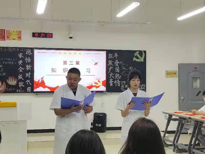 本次活动分为四个环节。首先同学们用豪情的团歌点燃了今夜,赵洪泽、龙双虹同学带来了《星星之火,可以燎原》节选朗诵,激励我们不忘初心、继续前进。接着由主持人童欣通过PPT的形式带领全班同学学习国家安全知识。随后是问答环节,主持人随机提问题,现场同学积极踊跃作答,现场气氛热烈。最后,由康复21301班的优秀同学展示拔火罐、艾灸等专业技能,鼓励大家学好专业知识,做好人民的健康卫士。