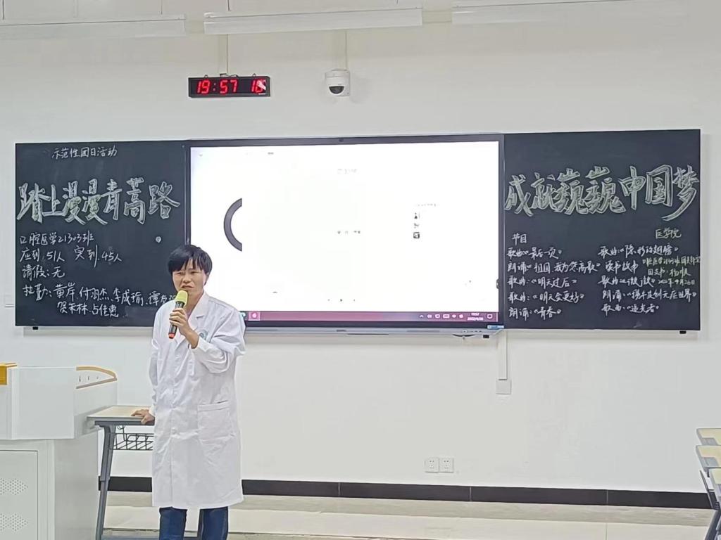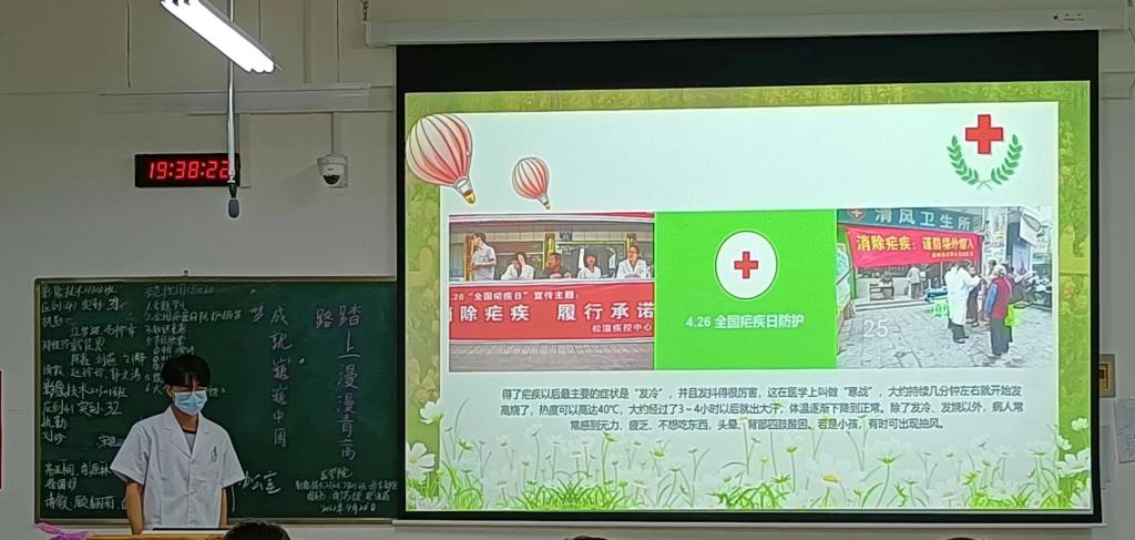 活动中,临床医学21302班的陈倩为大家带来演讲《控制疟疾,从我做起》,主要介绍了“什么是疟疾?哪些人最容易感染疟疾?疟疾是如何传播的?疟疾发病时有哪些症状和体征?怎么预防疟疾?”口腔医学21302班的邹东升朗读了一封感谢信,传达了屠呦呦和其团队胸怀祖国、敢于担当,团结协作、传承创新,情系苍生、淡泊名利,增强自信、勇攀高峰的青蒿素精神。