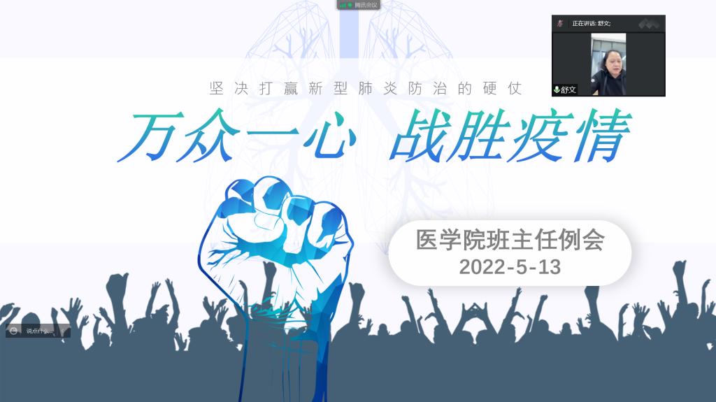 疫情突袭而至,宜春城区静态管理进入第六天,为继续做好学校疫情防控工作,保障师生安全健康,维护校园稳定,5月13日晚,医学院各班开展了“万众一心 战胜疫情”线上主题班会。