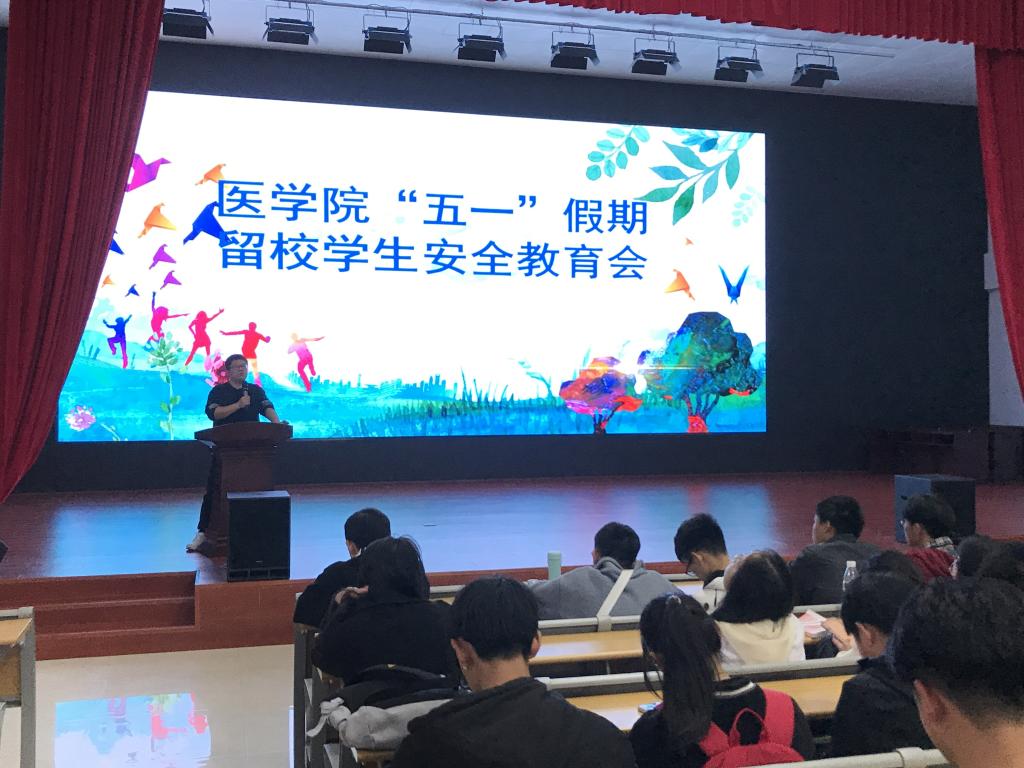 为做好“五一”假期期间的安全稳定工作,提高学生的安全意识和避险能力,确保留校学生度过一个安全和有意义的“五一”假期,4月28日中午,医学院在仁济楼小礼堂召开“五一”假期留校学生安全教育会,医学院320名留校学生参会,会议由医学院学工科科长李灿主持。