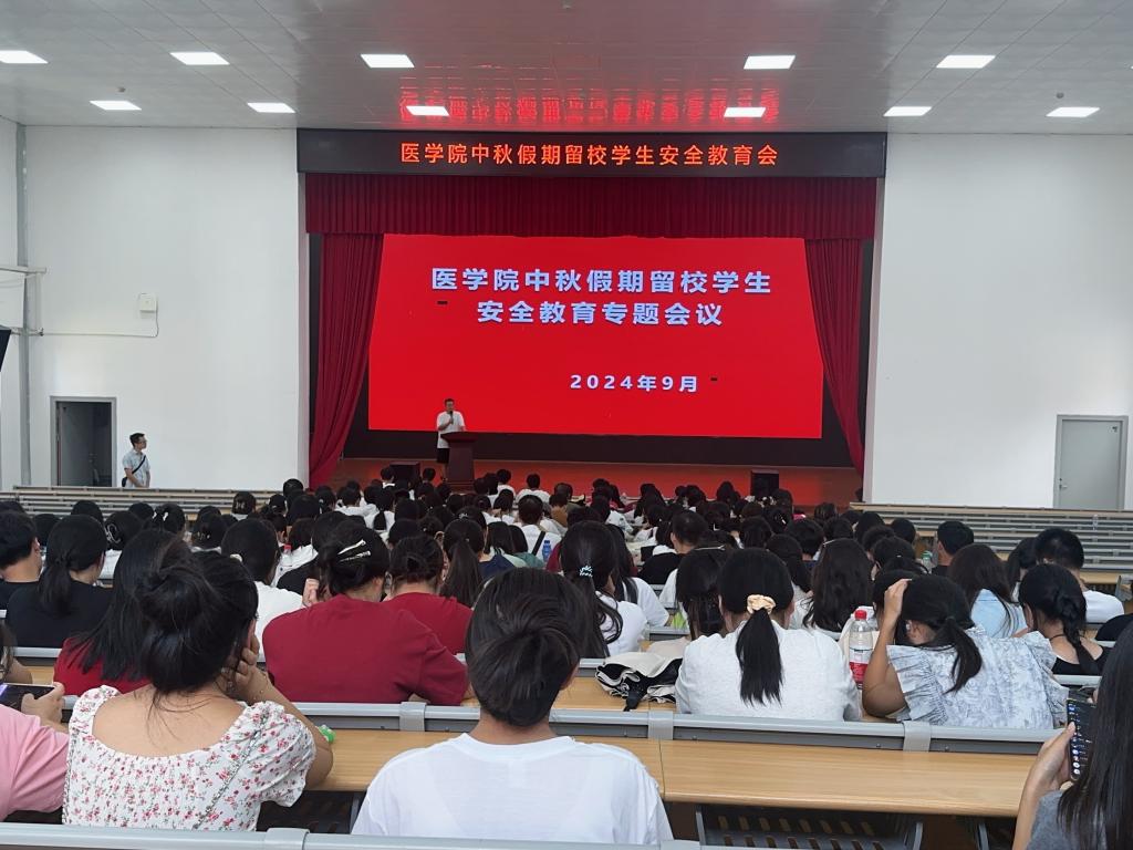 钟剑)为做好中秋假期留校学生安全教育工作,9月14日,医学院(附属医院)召开中秋假期留校学生安全教育会议,医学院(附属医院)学工干事李灿主持本次会议,学院中秋假期留校人数共1085人,各班留校学生代表参加会议。
