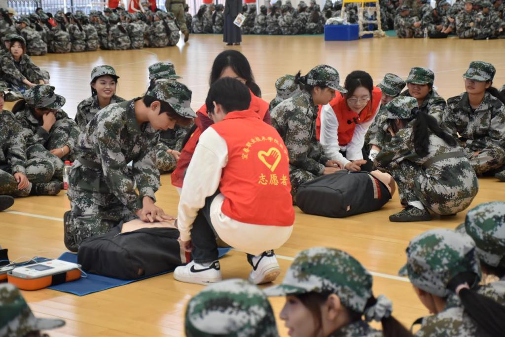 培训伊始,主讲人以急救“黄金四分钟”为切入点,深入浅出地讲解了掌握应急救护技能的重要性。随后,老师和志愿者通过理论讲解和实践操作相结合的方式,向新生们详细介绍了心肺复苏操作和AED使用方法等基本应急救护知识,结合实际案例,借助人体模型演示了急救的正确步骤、姿势、位置、力度和频率等细节。培训现场,军训新生认真聆听老师们的讲解。在实践操作环节,同学们在老师们的耐心指导下,轮流进行心肺复苏的操作演练。现场学习氛围浓厚,掌声不断。同学们纷纷表示,通过这次培训,他们不仅学到了实用的救护技能,还增强了面对突发事件的信心,是军训时光中的一段难忘经历。